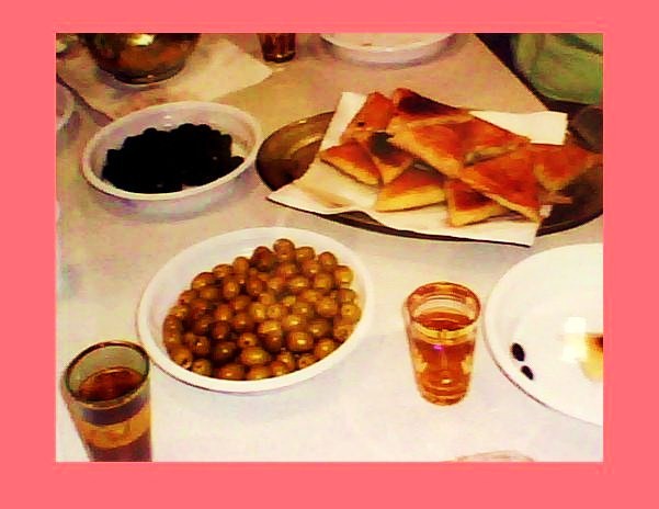 Entrée chaude, plat de bricks au poulet et aux amandes accompagnées d’olives et de thé à la menthe